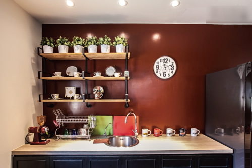 旧屋翻新案例中,酒红色壁面与木作铁件的组合充满复古风,仿佛身在咖啡店,制作轻食、手冲咖啡好方便~