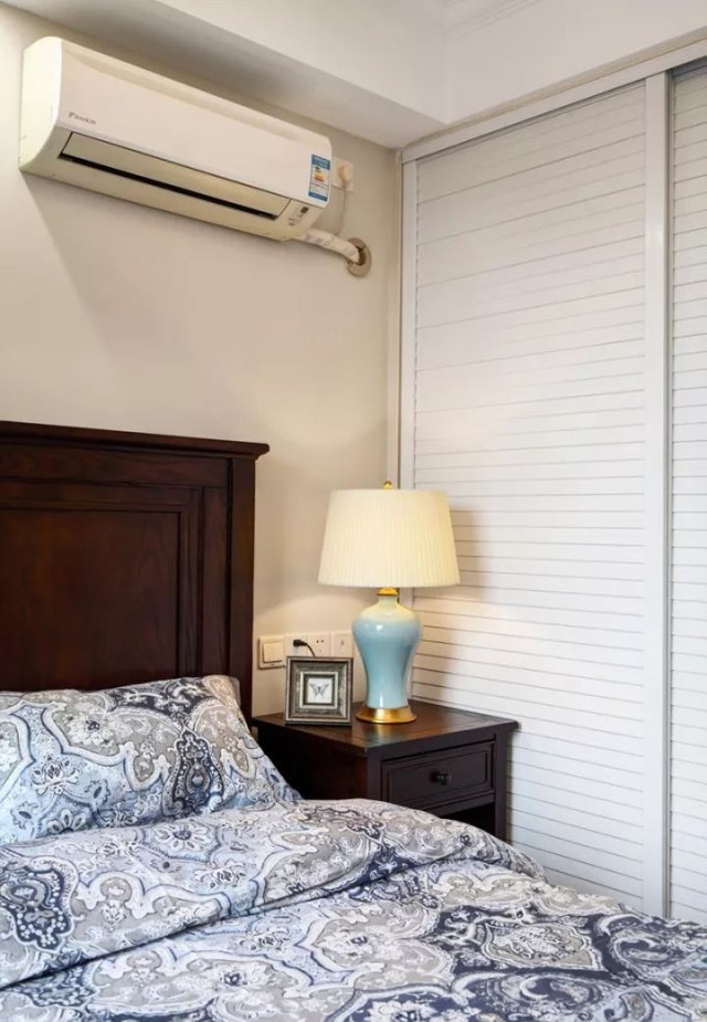 次卧的设计就会更简单一些,床和柜子的款式都是现代与美式结合的,在简洁当中带有一些典雅感。带有花纹的床品给次卧带来了一些设计感。