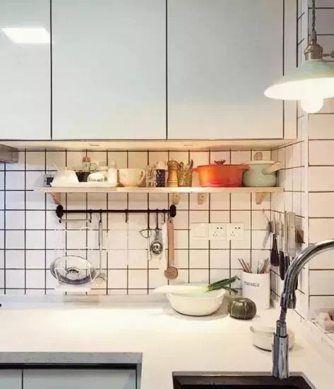 家里的厨房墙面空间直接装个隔板架,可以分两层来储物,一些小件的瓶瓶罐罐就可以摆放在隔板架上了;